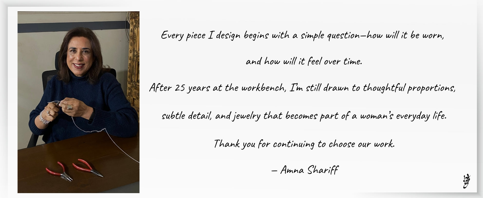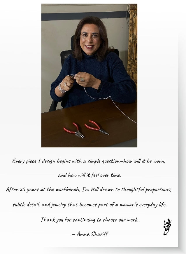 "Amna Shariff Jewelry in Silver and Gold Plated has roots in both the classical and the edgy. She is intrepid and eclectic in her choices of form, structure, balance and color. Her intuitive understanding of how these metal work against skin, how each piece sits or shifts with movement, have made her a designer of note. Not only are her regular exhibitions part of Lahore calendar, but she has made Amna Shariff Jewelry synonymous with elegance, timelessness and chic."