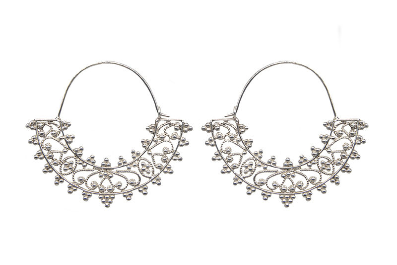 Filigree or Taarkashi, is a meticulous craft that involves skillfully soldering plain or twisted silver wire and granules to form intricate motifs. This technique requires patience and precision as very thin wires are delicately intertwined to create a symphony of fine textures and patterns. Made in Amna Shariff signature filigree style.                                                     •Handcrafted in 925 Silver.  Each piece is ethically produced and handcrafted from scratch to finish by our dedicated team of  artisans in our charming and cohesive workshop/studio. Each stage of production is diligently overseen, from melting and making the Sterling Alloy to finishing, to ensure highest quality of each piece. All our jewelry is handmade, slight variations may occur.