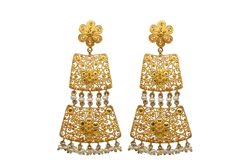 Filigree or Taarkashi, is a meticulous craft that involves skillfully soldering plain or twisted silver wire and granules to form intricate motifs. This technique requires patience and precision as very thin wires are delicately intertwined to create a symphony of fine textures and patterns. Made in Amna Shariff signature filigree style. Handcrafted in 925 Silver Pearls 24K Gold Plated  Each piece is ethically produced and handcrafted from scratch to finish by our dedicated team of artisans in our charming and cohesive workshop / studio.Each stage of production is diligently overseen, from melting and making the Sterling Alloy to finishing, to ensure highest quality of each piece. All our jewelry is handmade, slight variations may occur.