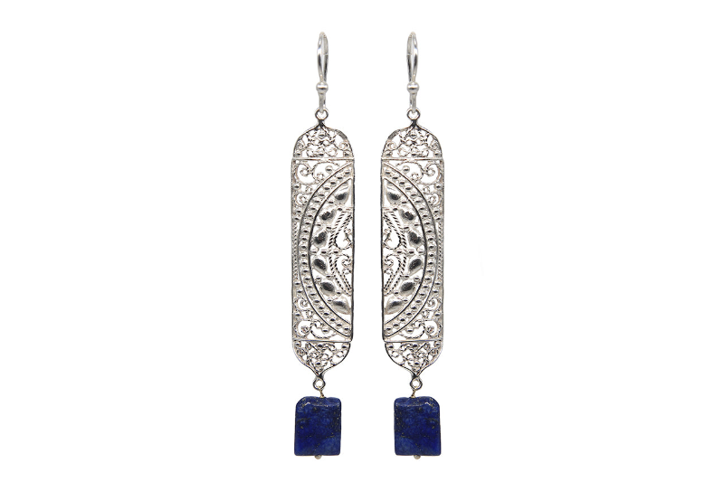 Filigree or Taarkashi, is a meticulous craft that involves skillfully soldering plain or twisted silver wire and granules to form intricate motifs. This technique requires patience and precision as very thin wires are delicately intertwined to create a symphony of fine textures and patterns. Made in Amna Shariff signature filigree style. Handcrafted in 925 Silver Lapis lazuli Bead  Each piece is ethically produced and handcrafted from scratch to finish by our dedicated team of artisans in our charming and cohesive workshop / studio.Each stage of production is diligently overseen, from melting and making the Sterling Alloy to finishing, to ensure highest quality of each piece. All our jewelry is handmade, slight variations may occur.