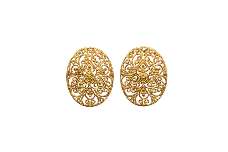Filigree or Taarkashi, is a meticulous craft that involves skillfully soldering plain or twisted silver wire and granules to form intricate motifs. This technique requires patience and precision as very thin wires are delicately intertwined to create a symphony of fine textures and patterns. Made in Amna Shariff signature filigree style. Handcrafted in 925 Silver 24K Gold Plated  Each piece is ethically produced and handcrafted from scratch to finish by our dedicated team of artisans in our charming and cohesive workshop / studio.Each stage of production is diligently overseen, from melting and making the Sterling Alloy to finishing, to ensure highest quality of each piece. All our jewelry is handmade, slight variations may occur.