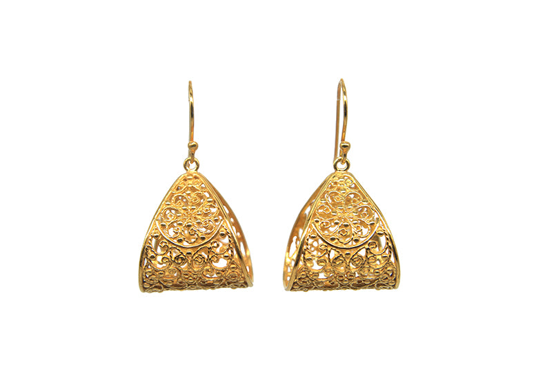 Filigree or Taarkashi, is a meticulous craft that involves skillfully soldering plain or twisted silver wire and granules to form intricate motifs. This technique requires patience and precision as very thin wires are delicately intertwined to create a symphony of fine textures and patterns. Made in Amna Shariff signature filigree style. Handcrafted in 925 Silver. 24k Gold Plated.  Each piece is ethically produced and handcrafted from scratch to finish by our dedicated team of artisans in our charming and cohesive workshop / studio.Each stage of production is diligently overseen, from melting and making the Sterling Alloy to finishing, to ensure highest quality of each piece. All our jewelry is handmade, slight variations may occur.