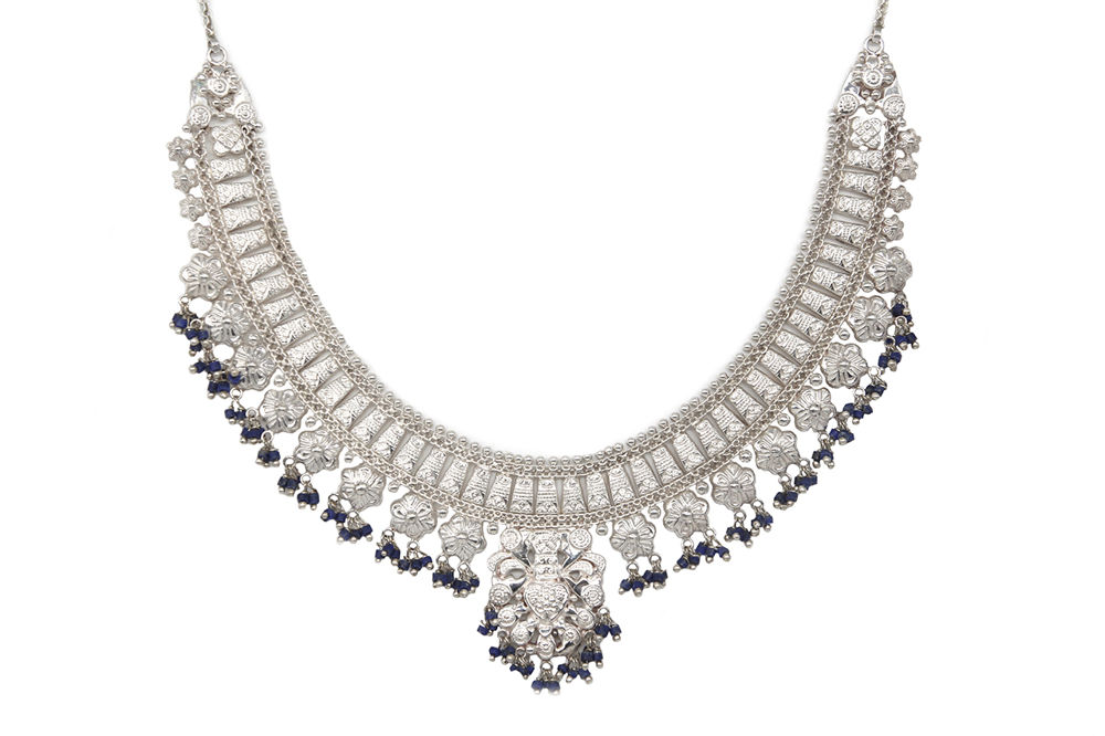 This Collection is an ode to our cultural heritage without being burdensome, a tribute to the past while embracing the modern world without losing its soul. The Yasmeen collection is my reflection in designing wedding jewelry. This collection is made in repousse technique, where each  motif is cut out and linked with other silver elements, creating decorative frames. This collection is in memory of my late mother. Handcrafted in 925 Silver Lapis lazuli Beads Each piece is ethically produced and handcrafted from scratch to finish by our dedicated team of  artisans in our charming and cohesive workshop / studio. Each stage of production is diligently overseen, from melting and making the Sterling Alloy to finishing, to ensure highest quality of each piece. All our jewelry is handmade , slight variations may occur.
